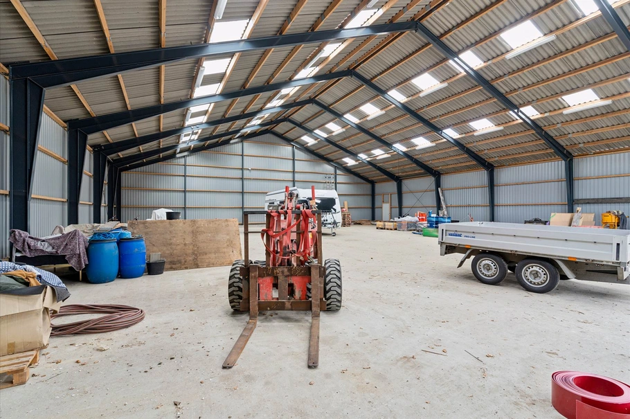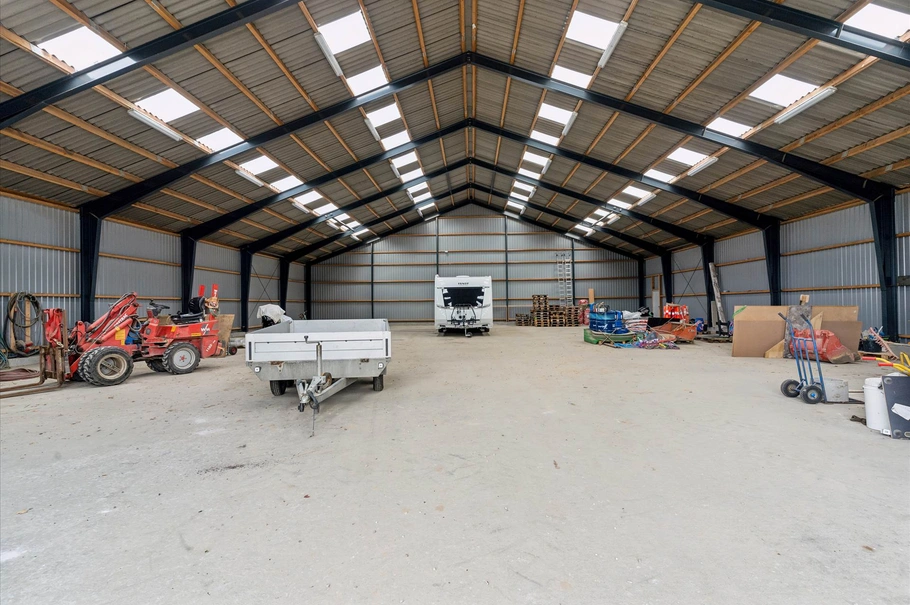 Med en stor højport på 4,2x5,45 m, solidt betongulv og en god loftshøjde på 8,25 m på det højeste punkt, tilbyder denne hal et fleksibelt rum til forskellige formål såsom lager, produktion eller opbevaring af køretøjer og både.