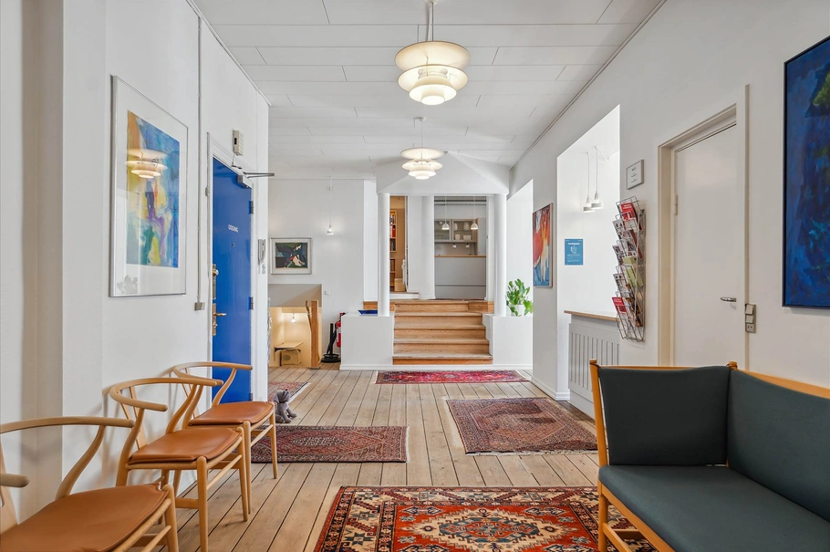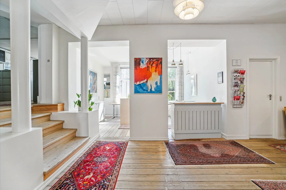 Fra foyeren er der ligeledes adgang kantine/køkken beliggende i sidebygningen hvor der er adgang til baggården og parkeringspladsen samt dør til kælder.