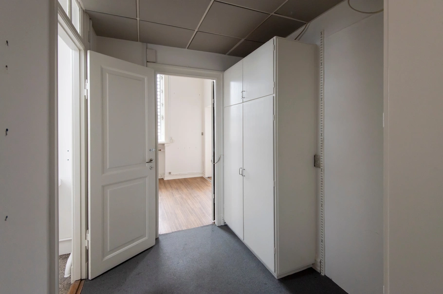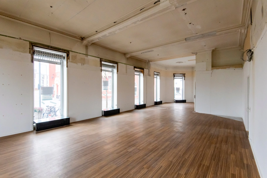 Lejemålet fremtræder ikke istandsat, med pudsede, malede vægge, støbt gulv med ældre belægning – højt til loftet med smuk gammel stuk, der skal repareres. Lokalerne har et herskabeligt præg over sig.