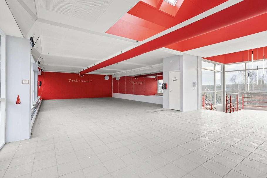I niveauet med parkeringspladsen finder man endnu et rigtig flot indgangsparti i glas, som også giver adgang til lejemålets niveauer. Dette areal er indrettet i en ganske åben planløsning med adgang til et lukket kontor. Der er etableret flotte herre/dame omklædningsrum med bademuligheder. Gulvet er her belagt med henholdsvis træ og fliser og loftet lavet i gips-akustik.