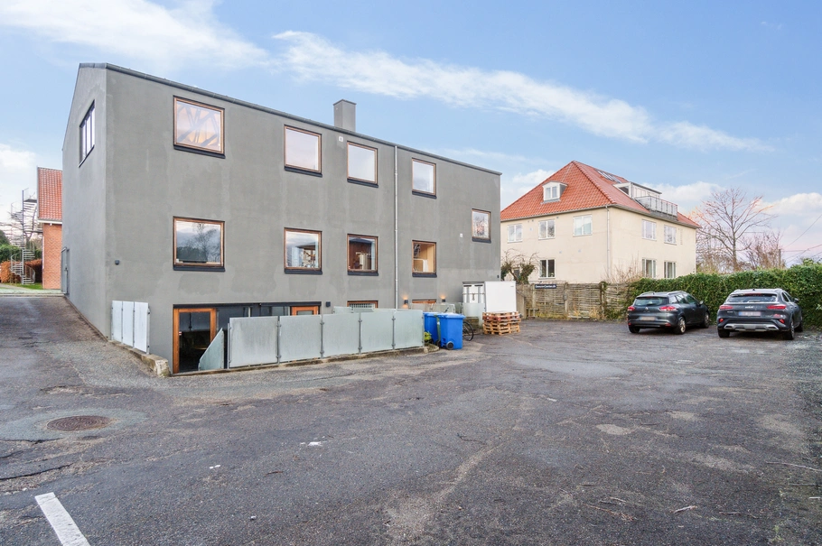 Der er parkeringspladser bag ejendommen, og der medfølger 3 stk. i lejemålet.
