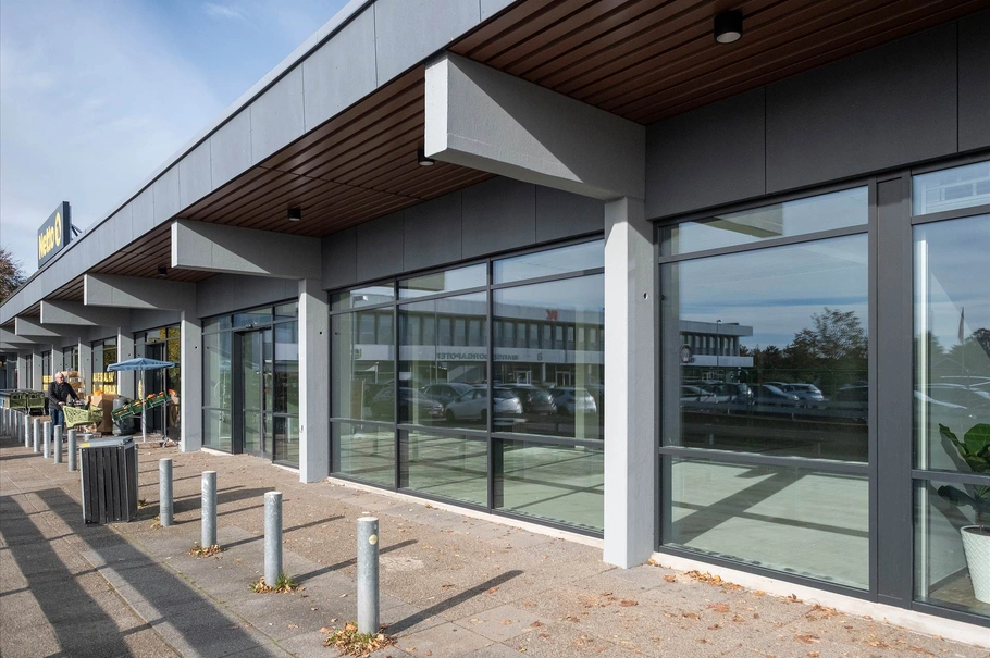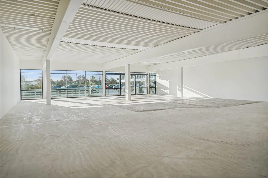 Salgslokalet har stor og bred glasfacade med sorte aluminiumspartier, og er rummeligt uden det store antal søjler. Her er en fin loftshøjde op til de hvide lofter. Gulvene er klar til pålægning af den øverste belægning, der findes i samarbejde med kommende lejere. Væggene fremstår helt nyspartlede og hvidmalede og lejemålet vil kunne indrettes med personalerum og toiletforhold.