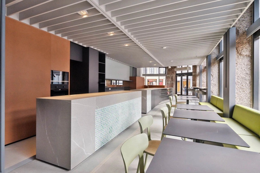 Gulvene er i et kapitel for sig - der er store speciallavede grå stenklinker på 1x1 m, mange ekstremt flotte detaljer på vægge, nye flotte vinduespartier etc.