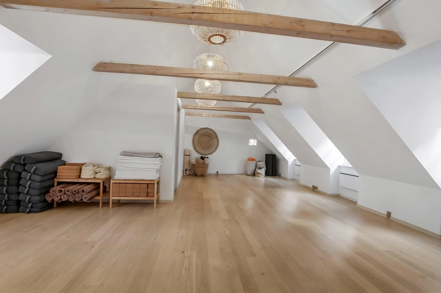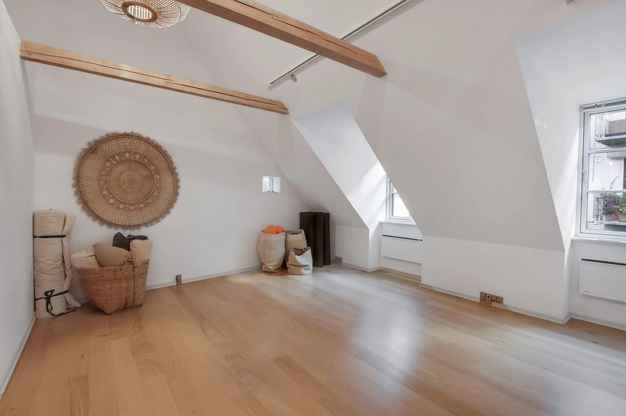 Lejemålet er kendetegnet ved højt til loftet, synlige spær, mange sprossede vinduespartier, der giver et skønt lysindfald, og en stilfuld indretning, som kombinerer klassiske og moderne elementer.