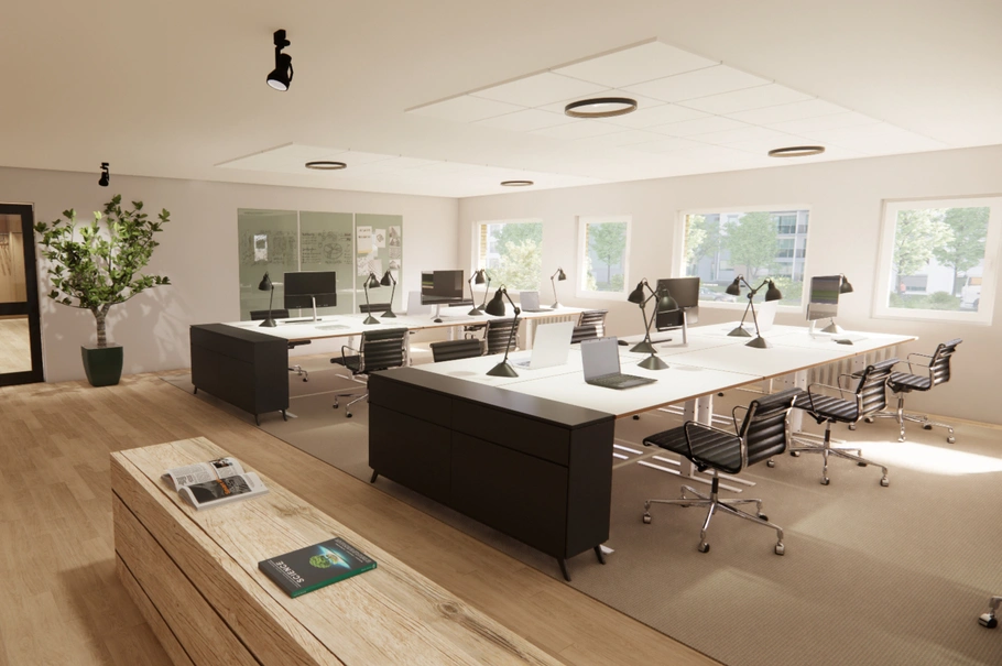 Med arbejdsplads her, vil man nyde godt af meget dagslys, der strømmer ind fra begge sider af bygningen, hvilket bidrager til en oplyst og behagelig arbejdsoplevelse for alle medarbejdere.