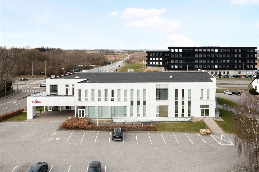 Bygningen står med langstrakt facade i hvidt og glaspartier, er indrettet i 2 etager samt kælderareal, og herudover rigtig gode udearealer med blandt andet parkering.
