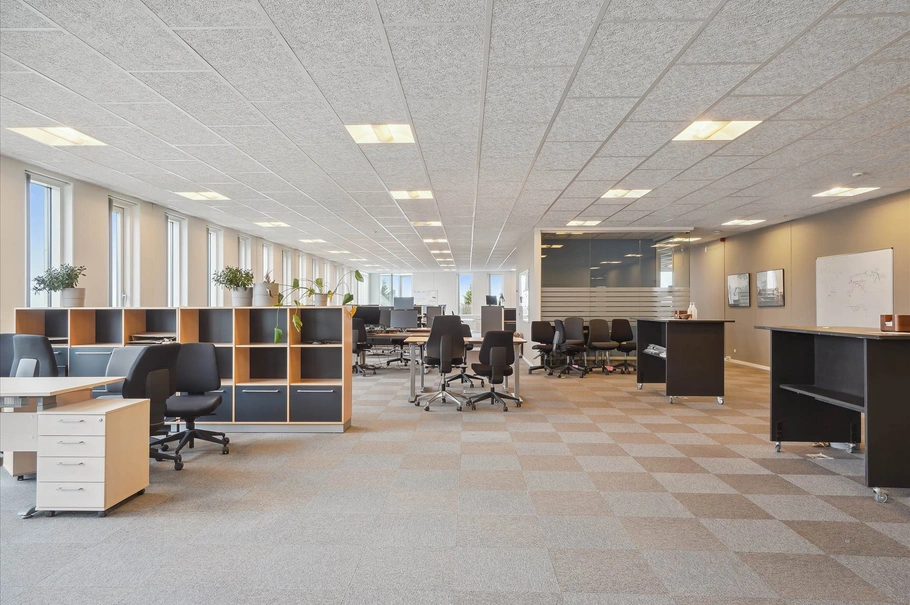 Lejemålet der udbydes her, er beliggende på ejendommens 1. sal og udgør 1.115 m², heraf 74 m² tagterrasse. Der er præsentabelt indgangsparti med trappe og elevator, og så har man ellers det samlede kontorareal på 1. salen. Materialevalget er godt og tidsløst, indretningen er med stort åbent kontorlandskab, mindre kontorer, mødelokaler i forskellige størrelser, toiletter, køkken og badefaciliteter.