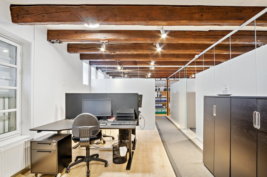 Lokalerne er primært indrettet med storrumskontor, men har en fleksibel indretning. Gulvene er belagt med flotte plankegulve, væggene er hvidmalede og der er fritliggende hanebånd, som bidrager til det meget charmerende miljø.