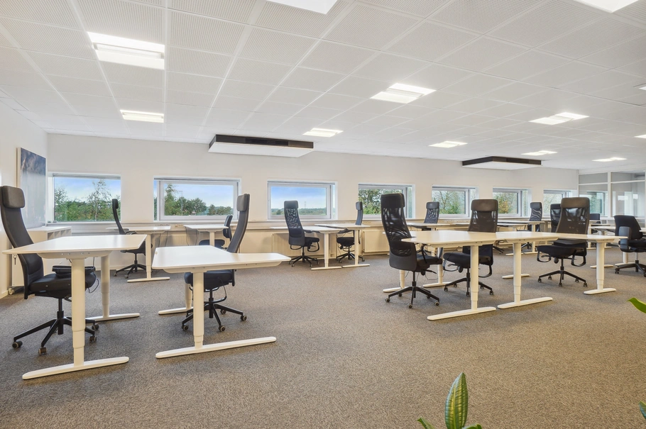Lokalerne er indrettet med en god kombination af åbent kontormiljø og selvstændige kontorer/mødelokaler. Hertil gulvtæpper og systemlofter med indbygget lys og akustik.