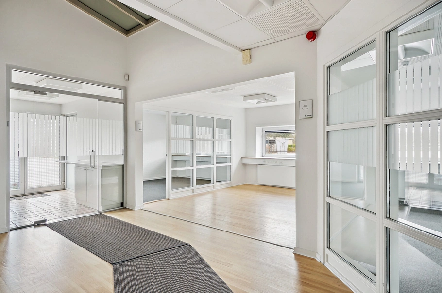 Fra receptionen er der adgang til mindre kontorfløj på ca. 185 m², indeholdende 5 kontorer i forskellige størrelser, toiletter samt reception og egen indgang, der eventuelt kan lejes separat.