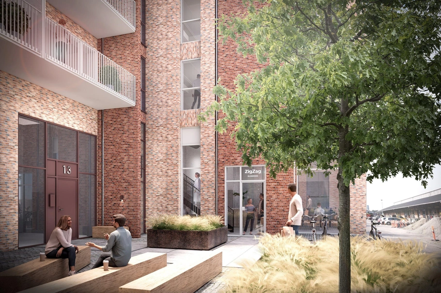 Imellem disse bygningskroppe skabes grønne gårdrum med ophold og zigzag-formen opstår. Mod nordvest placeres de 8 erhvervslejemål for at skabe en mere levende stueetage mod Godsbanehallen.