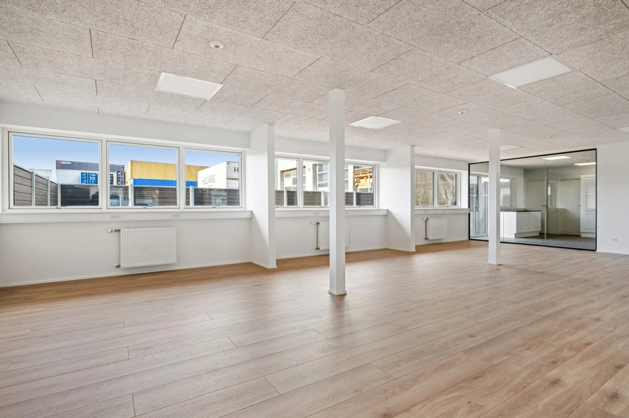 Lejemålet er nyindrettet og fremstår flot, indbydende og klar til en lejer. Her er to storrumskontorer som eventuelt kan inddeles, hvor det ene har udgang til egen, solrig terrasse. Herudover er der et godt mødelokale, kantine, printerrum, to toiletter, hvor det ene er med bad.