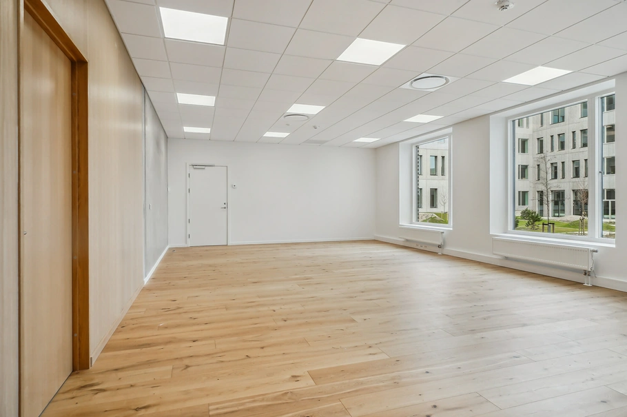 • Fællesområde med mødecenter, lounge og touch down spaces