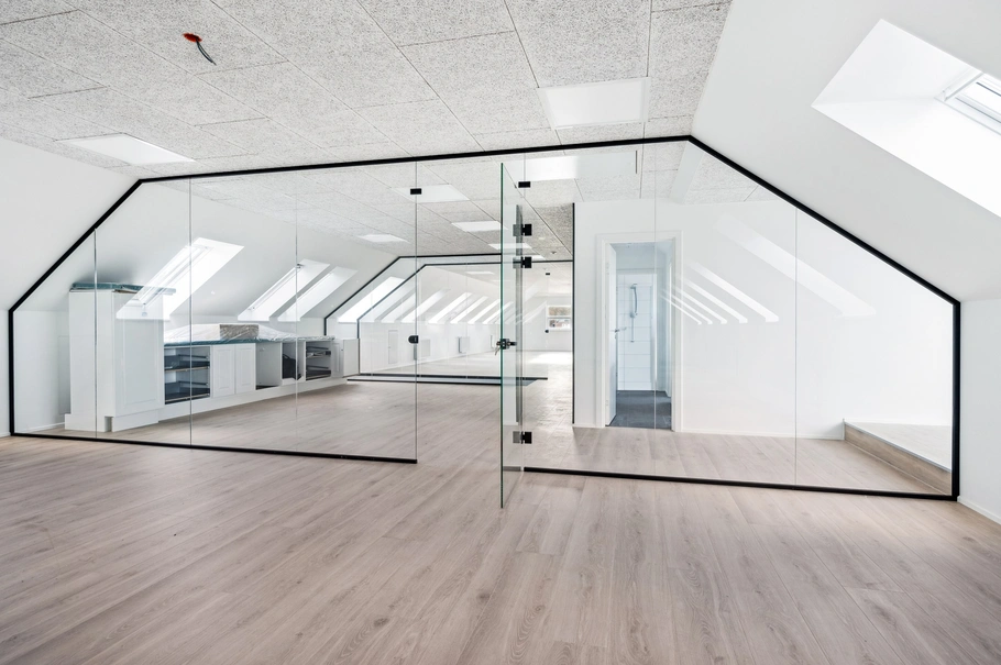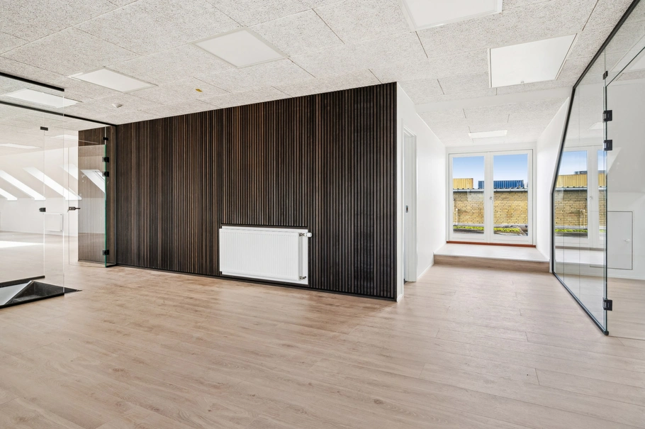 Lejemålet er nyindrettet og fremstår flot, indbydende og klar til en lejer. Her er to storrumskontorer som eventuelt kan inddeles, hvor det ene har udgang til egen, solrig terrasse. Herudover er der et godt mødelokale, kantine, printerrum, to toiletter, hvor det ene er med bad.
