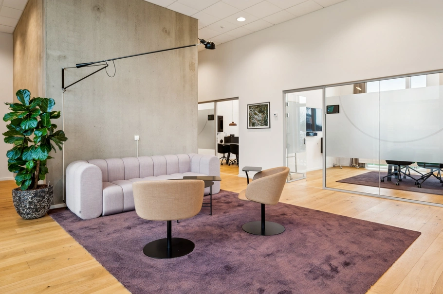 Du fornemmer den gode kvalitet i lejemålet straks du træder indenfor. Her er tæppebelagte gulve, loftsbeklædning med integreret loftsbelysning og ventilation m. køl. Trappekernen er opført i rå beton med flot træbeklædning, som fuldender kvalitetsindtrykket i hele lejemålet.