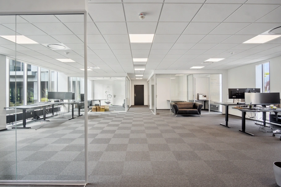 Gulve er tæppebelagte, og lofter er nedhængte med indbygget LED.