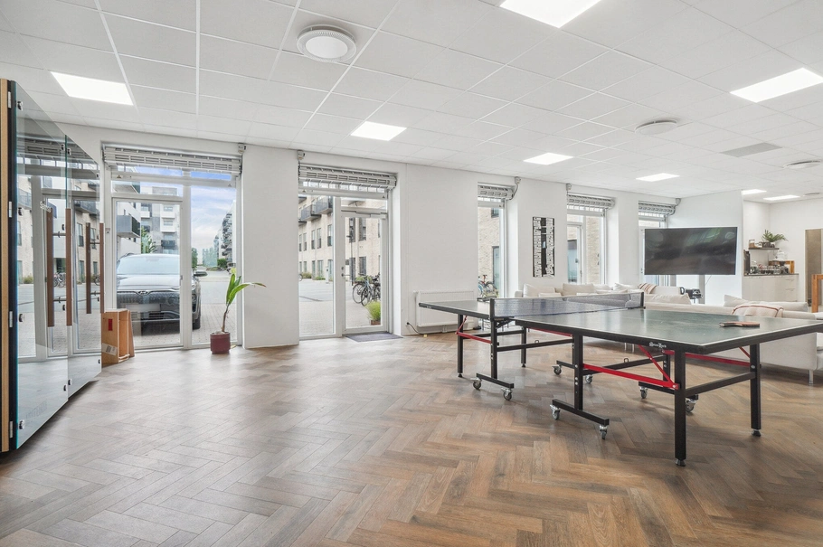 Her udlejer vi nu et moderne og indbydende kontorlejemål med flot sildebensparketgulv, LED-belysning og ventilation med køl. Lejemålet har en åben indretning med plads til op mod 60 arbejdspladser samt 4 mødelokaler / lukkede kontorer.