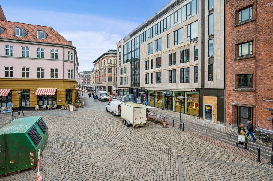 Indgangen til ejendommens kontorlejemål er på Skt. Clemens Torv. Man ankommer til den ledige etage på 1. sal via en stilfuld og enkel opgang med elevator.