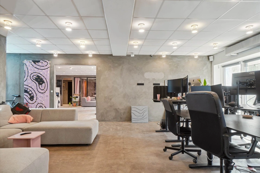 Lejemålet er i øjeblikket indrettet som kontor med to store, fleksible rum, der let kan tilpasses til forskellige behov, herunder antal af kontorpladser og mødelokaler i forskellige størrelser. Det vurderes, at der kan skabes plads til ca. 16-18 arbejdsstationer, afhængigt af indretningen. På nuværende tidspunkt rummer lejemålet derudover et rummeligt mødelokale, to toiletter samt et moderne køkken med mulighed for etablering af et fælles spiseområde. Indretningen med pudset betongulv og rå vægge skaber et unikt og stemningsfuldt udtryk, og efter aftale kan de nuværende systemlofter fjernes for at eksponere det rå betonloft, som understøtter det industrielle look.