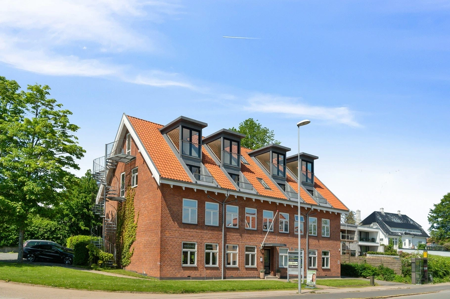 Kontoret ligger på 2. og 3. sal i en solid rødstensejendom, som sikrer et udtryk af kvalitet. Lejemålet entréres via præsentabel trappe og så har lejemålet også en intern trappe, som giver adgang til lejemålets 3. sal. Kontoret er særdeles lyst og indrettet til storrumskontor. Kontoret har hele 4 altaner på 2. sal og 4 franske altaner i karnap på 3. sal (her er der udsigt til Aarhus Bugten). Lejemålet har lyse trægulve samt gipslofter med lyddæmpende effekt. Lejemålet har adgang til et flot køkken/frokoststue på 1. sal (deles med anden lejer også) samt gode toiletfaciliteter i stueplan (deles også med anden lejer).