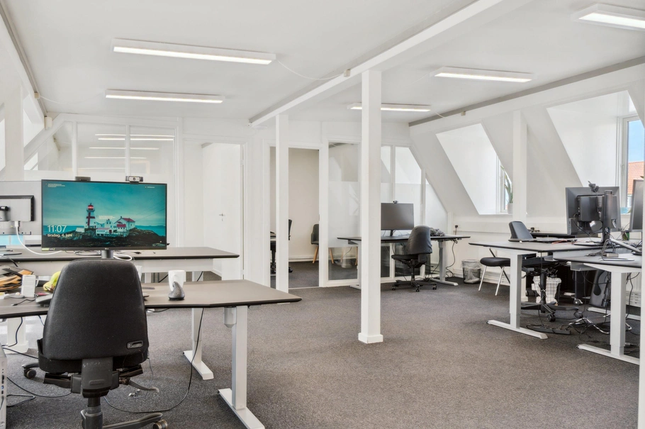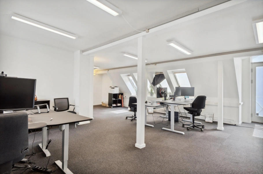 Dette lejemål tilbyder lyse kontorlokaler, der er placeret øverst i bygningen, hvilket giver et fantastisk naturligt lysindfald og en behagelig arbejdsatmosfære.