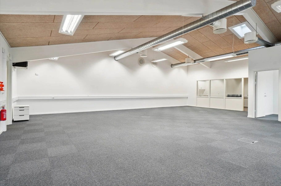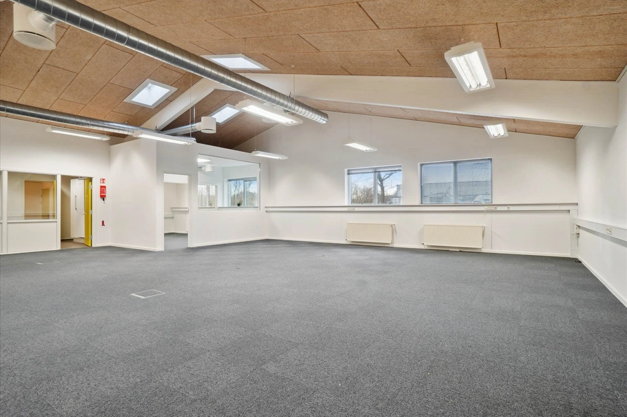 Lejemålet er indrettet som storrumskontor med mødelokale, personalekøkken, toilet samt et større lavloftet depotrum. Depotrummet er velegnet til opbevaring eller lounge for medarbejderne.