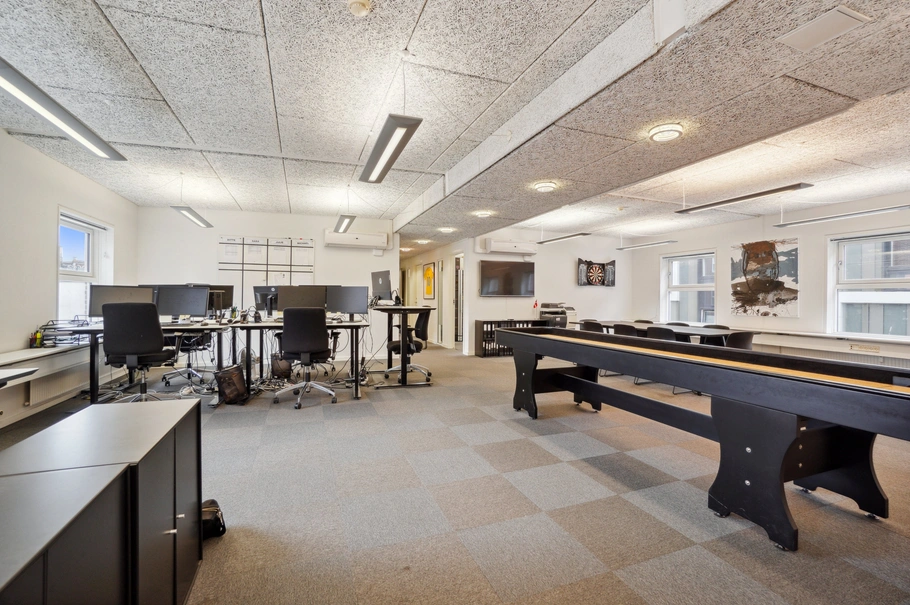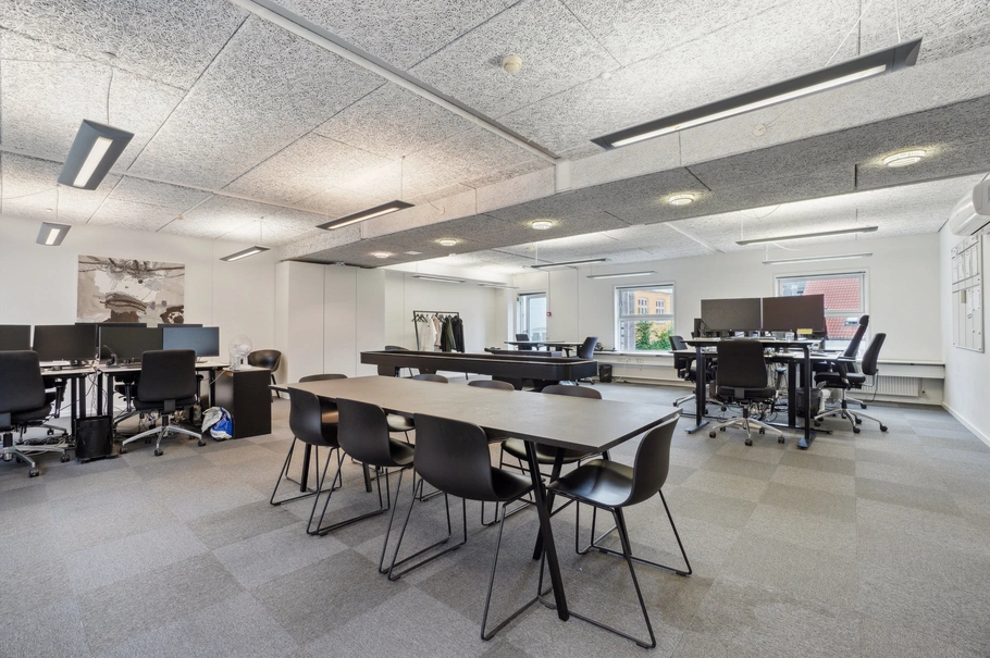 de øvrige kontorlejere. Det ledige lejemål på 180 m² er beliggende på 2. sal. Indretningen omfatter tre rummelige mødelokaler/kontorlokaler samt et praktisk tekøkken. Lejemålet har et stort storrumskontor med plads til mange kontorpladser, hvilket gør det ideelt til både små og større teams. Der er installeret aircondition for at