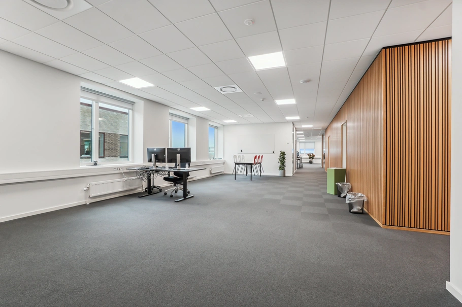 Kontoret er beliggende på 2. sal og har et bruttoareal på 698 m², hvoraf 491m² udgør