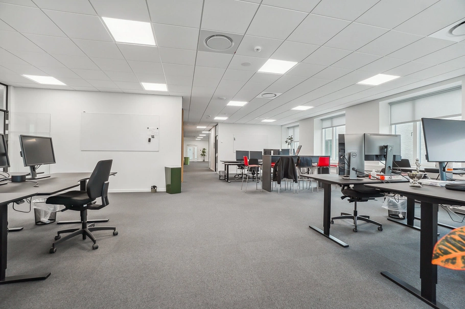 Indretningen består af et åbent storrumskontor med dertilhørende møderum/