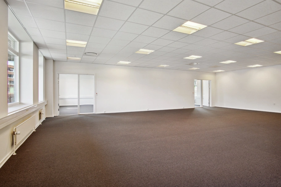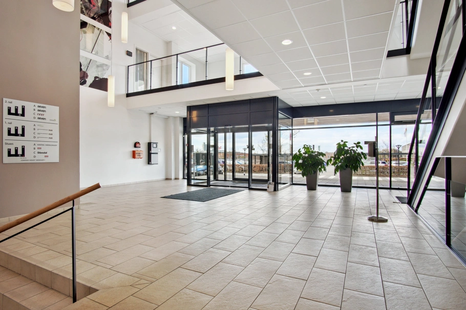 indgangsparti i ejendommen. Lejemålet er indrettet som et åbent storrumskontor, hvor endnu et stort lokale kan tilgås. Med denne indretning har en kommende lejer mulighed for eksempelvis at have to forskellige afdelinger siddende i hvert sit storrumskontor. I lejemålet er der et mindre tekøkken samt et toilet.