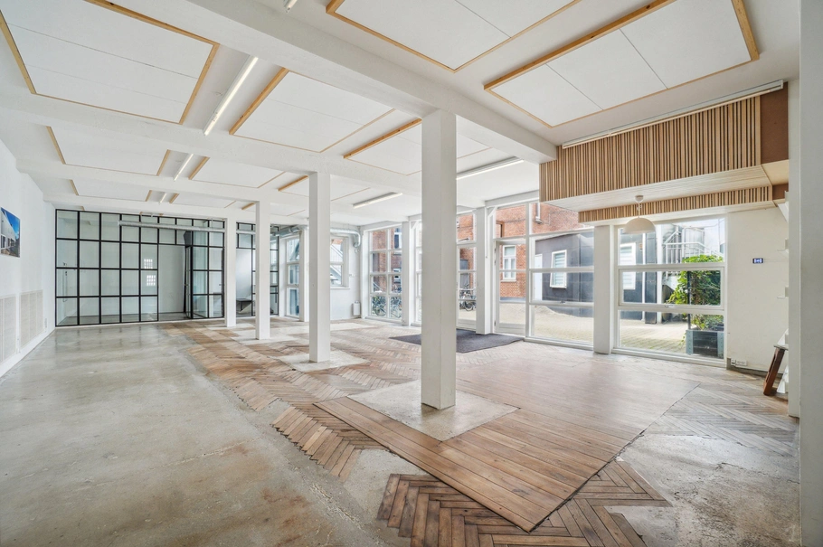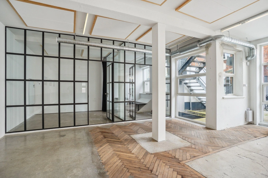 Lejemålet på samlet 220 m2 ligger i et charmerende baghus og fremstår moderne med en rå, industriel stil. Gulvene er udført i en kombination af træ og beton, hvilket komplementerer den åbne og lyse atmosfære, hvor der er højt til loftet og rig mulighed for at tilpasse indretningen efter behov.