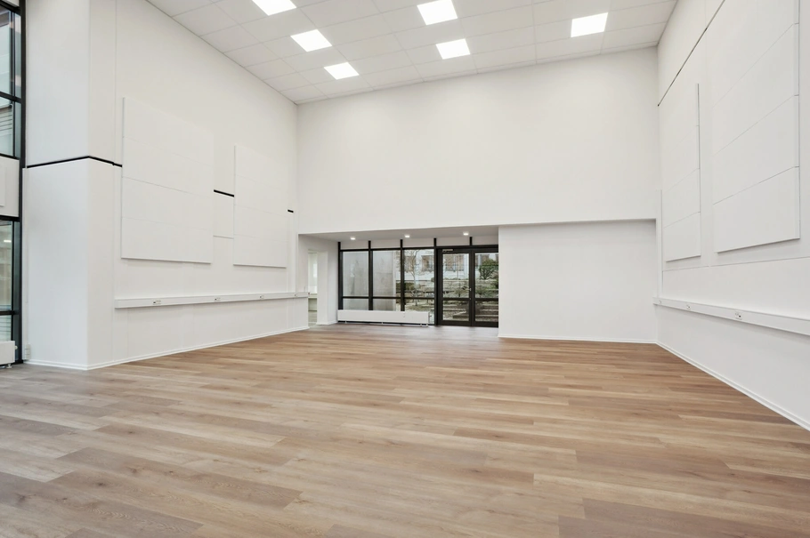 Det største lokale i lejemålet har en imponerende loftshøjde, som skaber en rummelig fornemmelse og samtidigt giver et flot naturligt lys fra de store vinduer.