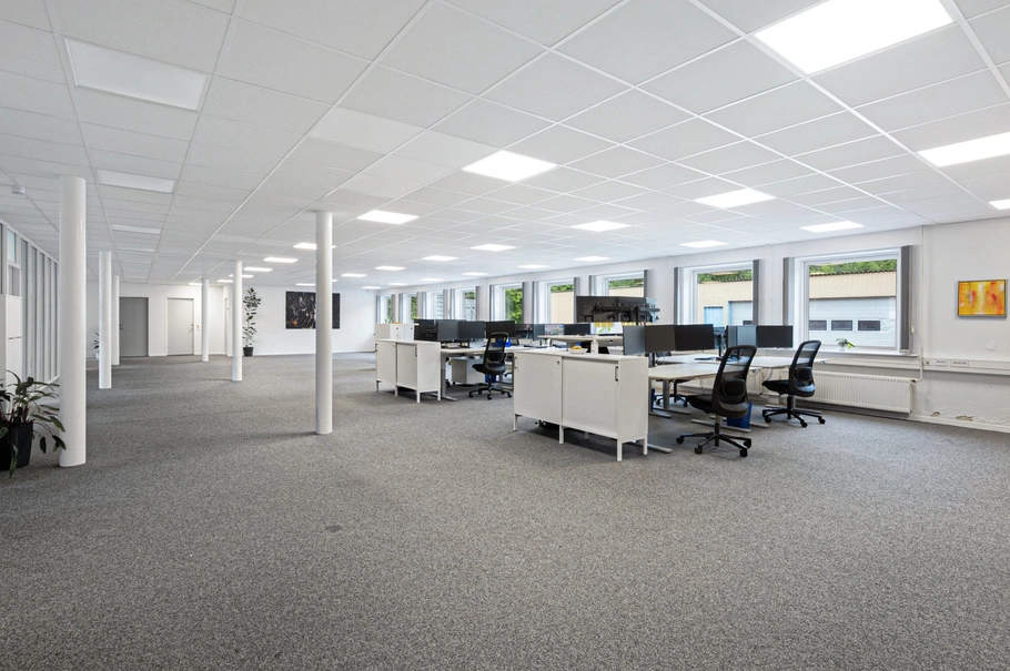 Lejemålets 450 m² er velindrettet med et markant storrumskontor, et stort møderum, 3 regulere kontorer, kantine, to toiletter og depot samt opbevaring.