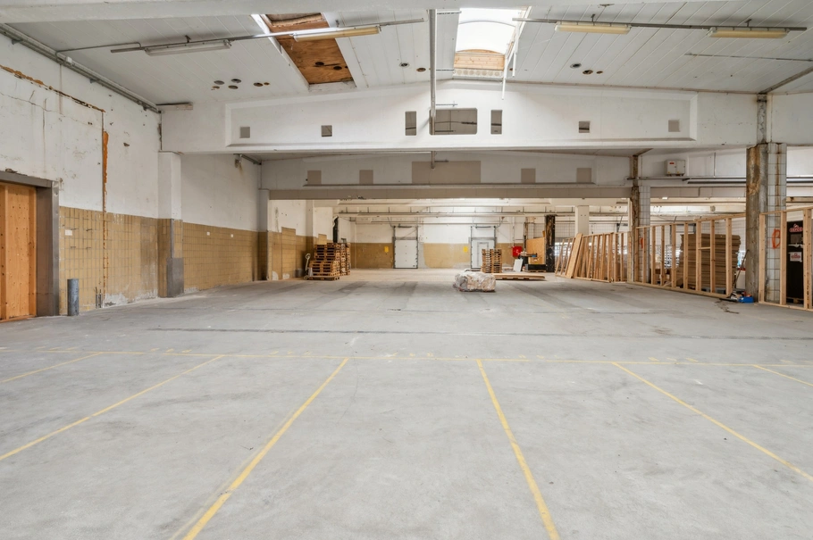 Lageret er vel belyst qua de mange ovenlysvinduer, og det solide beton- og klinkegulv skaber en solid bæreevne.