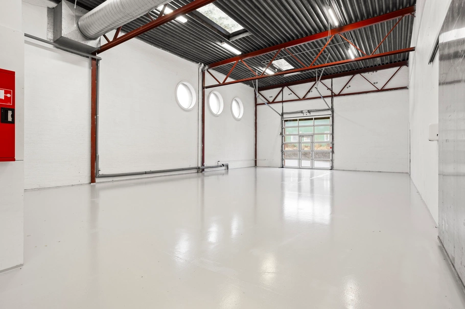 Arealerne i lager-/produktionsafsnittet består af to sammenhængende haller med intern gennemgang. Hallerne er meget regulære, søjlefrie og har en god loftshøjde med 4,3 meter under spær og 5,6 meter til loftet imellem spær. Hallerne fremstår med hvidmalede vægge, der, sammen med de mange ovenlysvinduer og belysningen i loftet, skaber et lyst og venligt arbejdsklima. Gulvet er betongulv, som i den ene hal er epoxymalet. Adgangen til hallerne sker via en overdækket aluhejseport i niveau med udvendigt terræn med målene 3,0 x 3,0 meter. Porten har integreret dørparti.