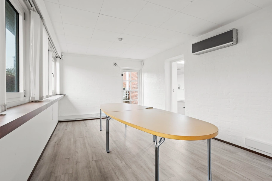 Kontorlokalerne fremstår lyse og indbydende. I storrumskontoret er gulvet praktisk belagt med linoleum, mens lofterne er akustikregulerende troldtektlofter med opsat LED-grundbelysning. I det tilstødende kontor/ mødelokale sikrer et gennemgående vinduesparti i bygningens facade et godt lysindfald, mens gulvet her er belagt med et pænt ”trægulvslignende” laminatgulv. Lokalerne er endvidere forsynet med varmepumper, som både kan varme og køle og dermed sikre et behageligt indeklima.