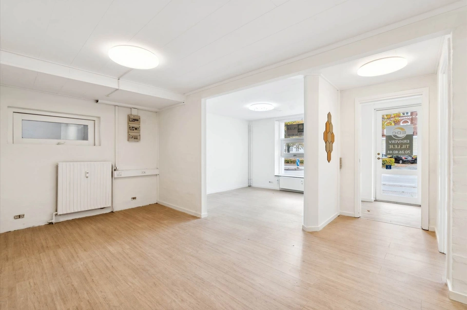 Lejemålet byder på en hvidpudset facade og store vinduer, der giver et behageligt naturligt lys. De 68 m² er effektivt opdelt i ét større rum og to mindre lokaler, der tilbyder fleksible anvendelsesmuligheder, alt efter dit behov. Tilbagetrukket fra de primære lokaler findes yderligere et baglokale til opbevaring eller lignende, samt faciliteter såsom toilet og mindre køkken.