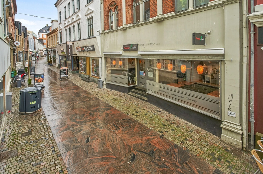 Stueplan på ca. 80 m² består af lyst butiks-/restaurant-/cafélokale med vinduesparti ud mod gågaden, mindre køkken- og opvaskeområde samt kundetoilet.