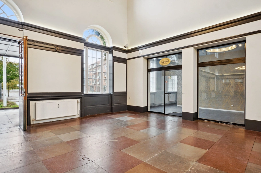 Butiks- eller kontorlokaler i den karakteristiske stationsbygning i Horsens. Bygningen er tegnet af K.T. Seest og opført i 1929 i røde teglsten og med store vinduesfacader ud mod forplads, forhal og perron.