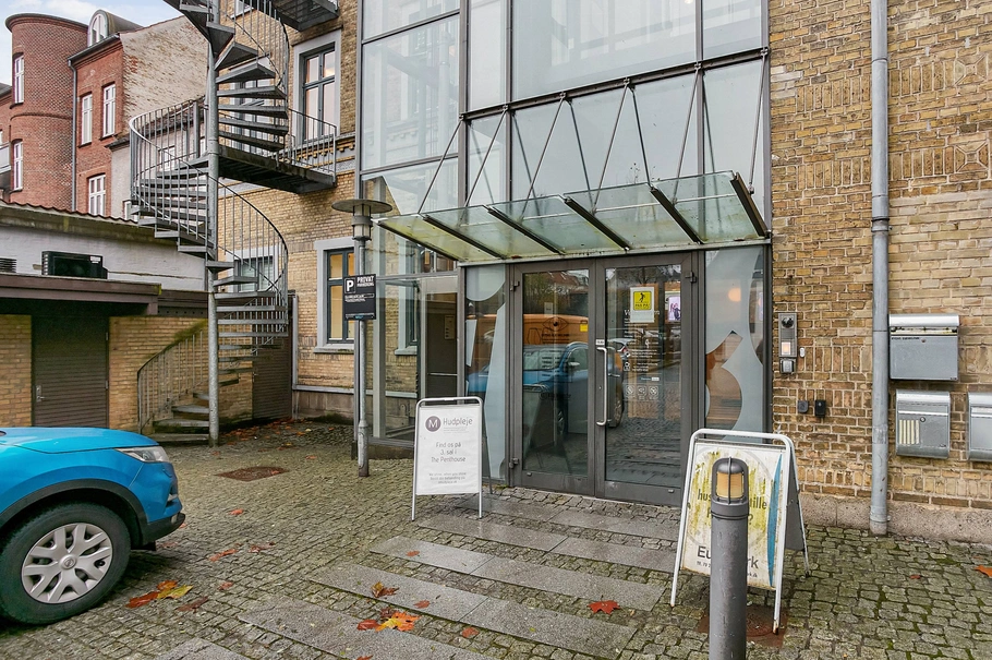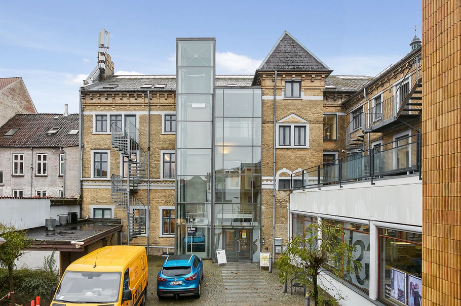 Beliggende ca. 100 m fra hovedstrøget Søndergade, ca. 90 m² fra off. p-plads, ca. 50 m fra parkeringshus og ca. 500 m fra banegården.
