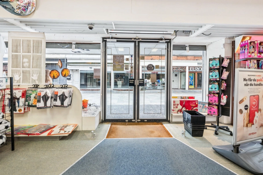 Lejemålet har en fremragende eksponering takket være de store udstillingsvinduer og den lange facade mod gågaden, hvilket sikrer maksimal synlighed. Det centrale indgangsparti fører direkte ind i et rummeligt og åbent butikslokale, der med sin lyse og indbydende indretning præsenterer sig særdeles præsentabelt og imødekommende for kunderne.