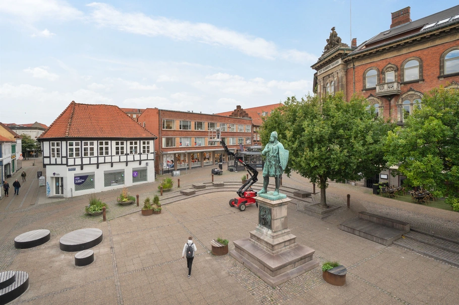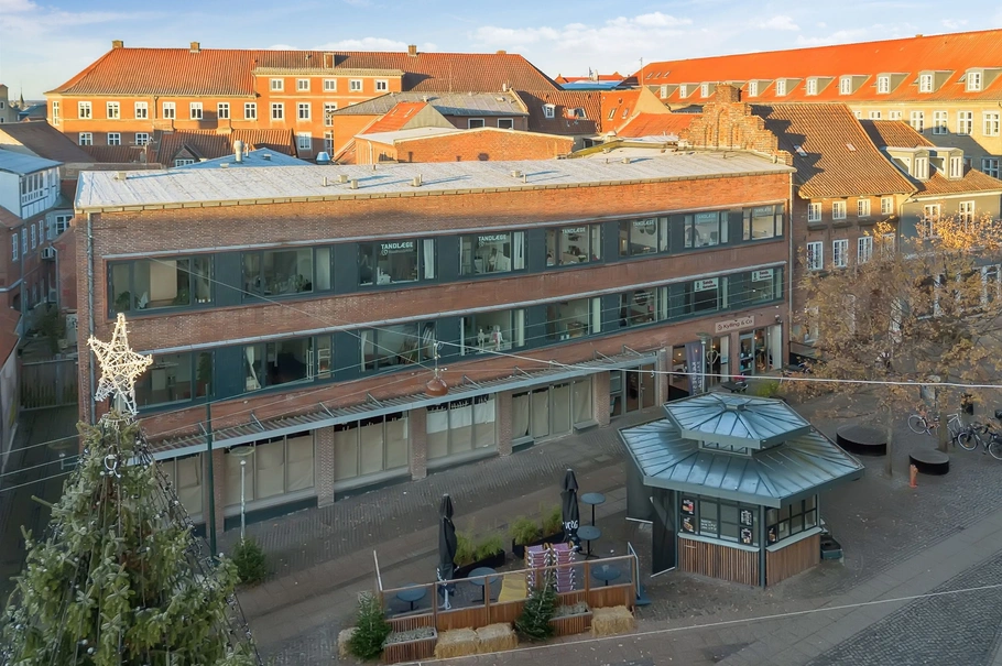 Beliggende helt centralt i Randers C med kig ned over Rådhustorvet fra dele af lokalet.