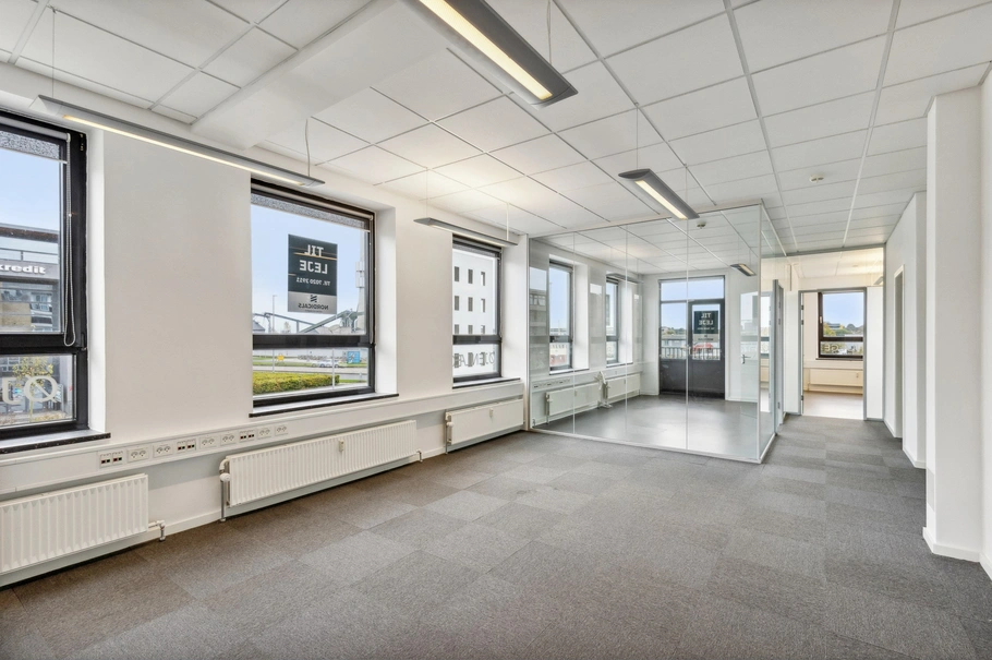 Indretning: Lejemålet er indrettet med 3 kontorrum/mødelokaler, et åbent kontorareal, 2 toiletter og et frokostrum med tekøkken.