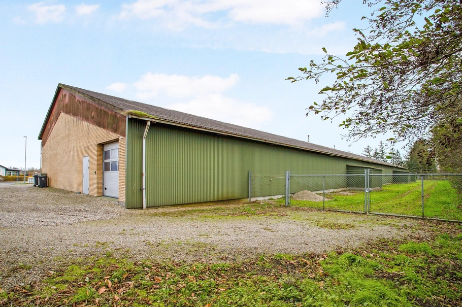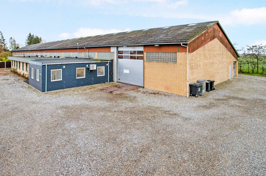 En virkelig regulær erhvervsbygning fra 1968/74 med et samlet isoleret og højloftet lagerlokale på 1820 m2, pt. opdelt i 2 på hhv. ca. 1.000 m2 og ca. 800 - hvor sidstnævnte har et delvist indskudt loft, samt portadgang i side (5 mtr) og gavl (3,5 mtr) i forbindelse med den lille port er der etableret værkstedsfaciliteter med smørregrav mv. Der er fra hallen indgang til kontorpavillion opført i 1995 på 42 m2. Hallerne er adskilt med isoleret let-skillevæg! Den store hal har portadgang i gavl (5 mtr.) og indgang til personalefaciliteter med stort bade- og omklædningsrum og toiletter, "personaleindgang", spiserum, samt te-køkken, med samlet areal på 87 m2.Endelig er der stort kontorrum og mødelokale + depot/severrum, samt indgangsparti med garderobeplads og gæstetoilet - samlet areal på 65 m2 Indflytningsklar erhvervsbygning - hvor man virkelig kan tale om "noget for pengene"! Alt fordi den ikke ligger i Randers eller direkte ud til E45, men derimod 12 km nord for Randers mod Mariager og med 6 km fin kørevej til E45/Purhus nedkørslen i både nord- som sydgående retning. Få km til Hvidsten Kro - hvor man kan byde kunder og forretningsforbindelser på historiske omgivelser og en go´ gang æggekage. Produktions/lagerbygningerne er opført i 1968 og mere end arealsfordoblet i 1974. Personale- og administrationsdelen kom på i 1985 og blev endelig suppleret med en ekstra kontorpavillion i 1995. Hallen er i dag opdelt i 2, men hurtigt og nemt reetableret til een stor hal, hvis det er behovet. Ejendommen står pt. tom, hvorfor lejeindtægten er forsigtigt anslået ud fra tidl. lejeindtægtStor parkeringsplads med perlestensbelægning og adgangsvej til hallen ad 2 porte, man kan også køre bag bygningen, så kommer man ud på stort hegnet grundstykke med indkørsel til den 3. port til hallen og god mulighed for matrialeopbevaring, opstilling af containere mv., her kommer også den anden indkørsel til bygningerne.
