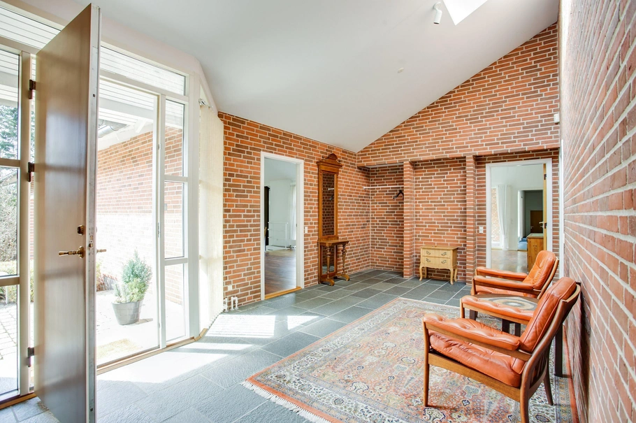 Boligdelen består af kælder, bryggers, køkken i åben forbindelse med alrum, spisestue og stue med niveauspring, soveværelse, værelse, badeværelse samt stor indendørs swimmingpool med badeværelse.