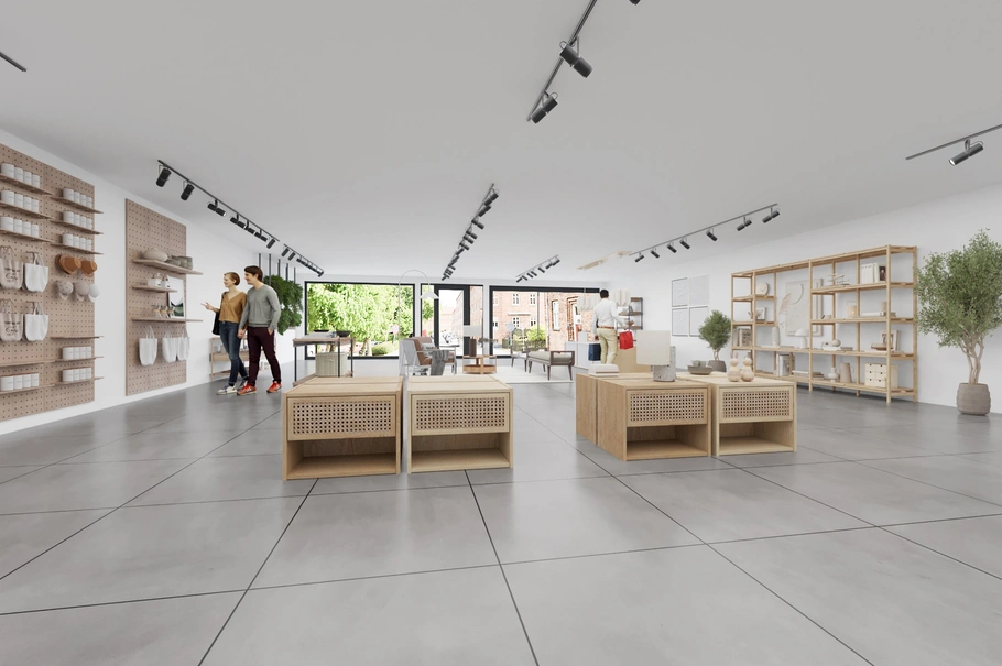 Butiksarealet på de forskudte plan bryder med den traditionelle, flade butiksstruktur og introducerer en dynamisk og fleksibel indretningsmulighed, der kan tilpasses efter virksomhedens behov. Den rummelige butik har god plads til både større udstillinger og intime, nicheprægede områder.
