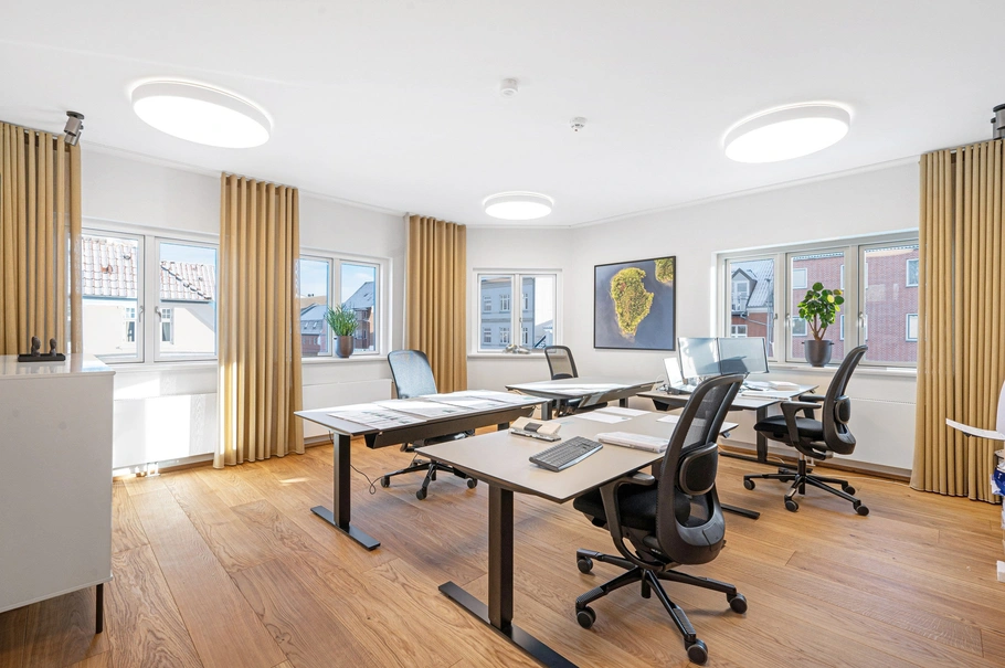Ved hovedindgangen bliver du mødt af et receptionsområde, hvorfra der er adgang til stueplan samt ejendommen øvrige etager via den smukke egetræstrappe. På alle etager er en lækker kaffelounge, som er et ideelt sted for et uformelt kundemøde eller snak med kollegerne. Endvidere toilet på alle etager. Kontorlokalerne bærer præg af omhyggelig istandsættelse og respekt for den oprindelige stil, samtidigt med at de fremstår moderne og indbydende. I hvert kontorlokale kan der være mellem 2-6 arbejdspladser. Der er ligeledes mulighed for mødelokale på alle etager. Fra 2 af lokalerne er der udgang til en stor terrasse eller altan.