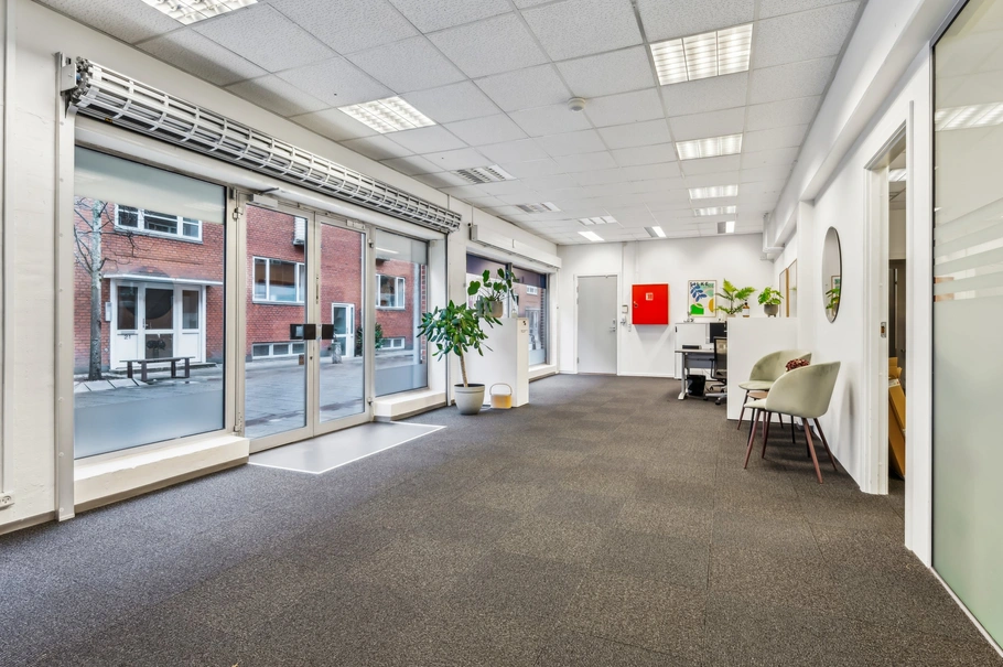 Når man træder ind i lejemålet, møder man først det store butiks-/ kontorlandskab. Herfra er adgang til tre kontorer med elegante glaspartier ud mod det store kontor. Den åbne og fleksible indretning skaber et miljø, der lettet samkvem og kommunikation, samt giver plads til koncentration og fokus, alt efter hvad arbejdsdagen bringer.