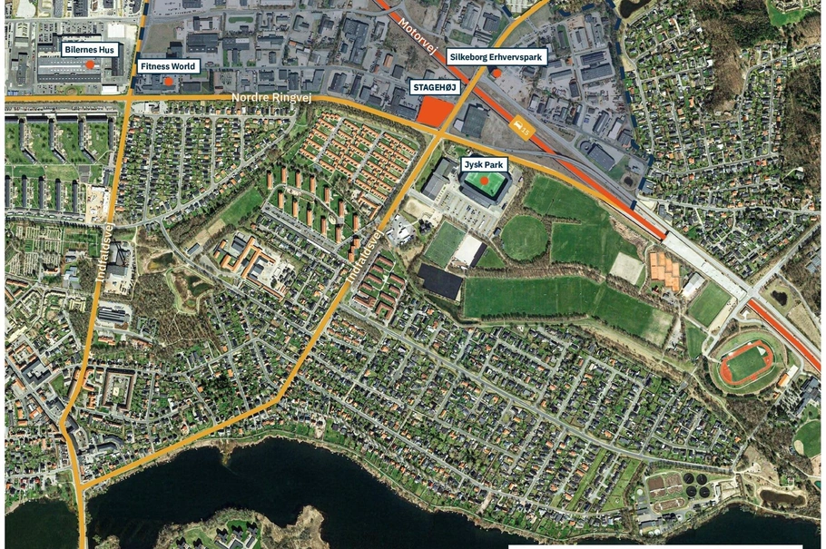 STAGEHØJ er optimalt placeret på kanten imellem den nye erhvervskorridor langs motorvejen, og den indre ringvej som markerer starten af Silkeborgs midtby. Placeringen er desuden knudepunkt for den nordlige indfaldsvej, Nørreskov Bakke, og den østlige motorvejstilkørsel til og fra Århus, hvorved tilgængeligheden i bil ikke kan blive bedre.