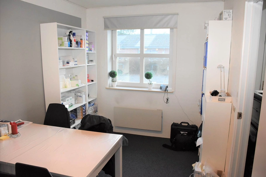 De 30 m² indeholder regulært kontor med mulighed for 2 kontorpladser eller 1 og mødebord, depotrum og toilet med håndvask - gang/indgangsparti kan udnyttes til arkiv, udstilling m.v. Lejemålet fremstår indflytningsklart og præsentabelt, med lyse lofter, vægge og mørkt gulvtæppe.
